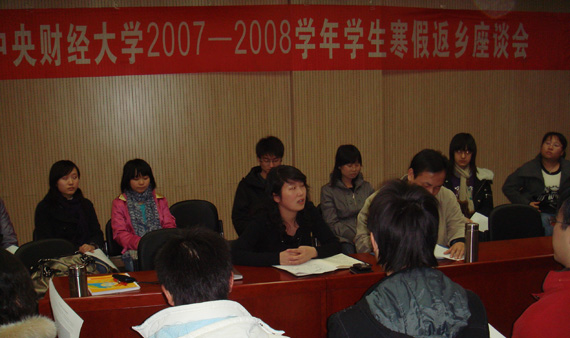 2月27日,我校2007—2008学年学生寒假返乡座谈会在行政楼105会议室召开。座谈会由学生工作部副部长楼晓英老师主持,学生处副处长郁泉老师、思想教育办公室、助学服务中心的老师和来自上庄校区、财政学院等18个单位的34名学生代表参加了此次座谈会。