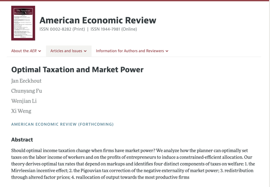 近日,中央财经大学金融学院副教授傅春杨与西班牙庞培法布拉大学Eeckhout教授、浙江大学李文健教授、北京大学翁翕教合作撰写的论文“Optimal Taxation and Market Power”在经济学五大顶刊之一The American Economic Review接收并在线发表。论文在线链接:https://www.aeaweb.org/articles?id=10.1257/aer.20211445。