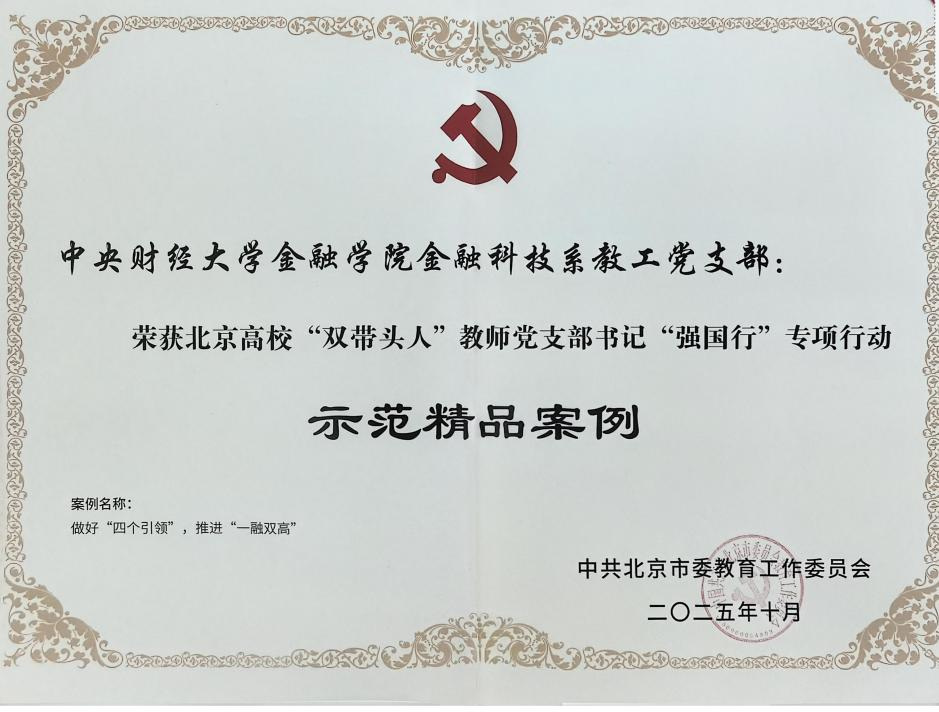 10月30日下午,北京高校“双带头人”教师党支部书记“强国行”专项行动示范案例交流展示会举行。我校金融学院金融科技系教工党支部作为入围团队展示案例《金融为民育英才 科技为盾铸安全》,获评“示范精品案例”。