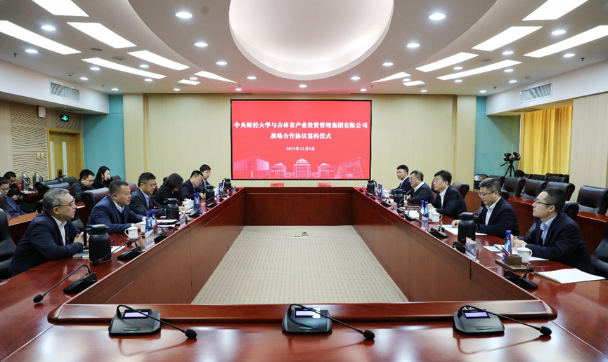 12月9日上午,我校与吉林省产业投资管理集团有限公司(以下简称“吉林产投管理集团”)战略合作协议签约仪式在学院南路校区学术会堂604举行。吉林产投管理集团党委书记、董事长田志龙,党委专职副书记刘宁,党委委员、副总经理赵鹏,我校党委书记吴国生,党委副书记杨莹出席活动,签约仪式由校长助理、金融学院院长张学勇主持。