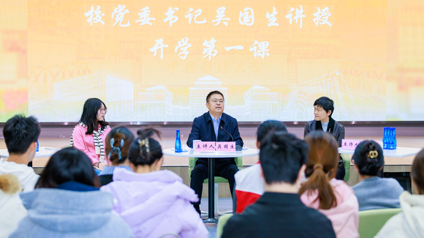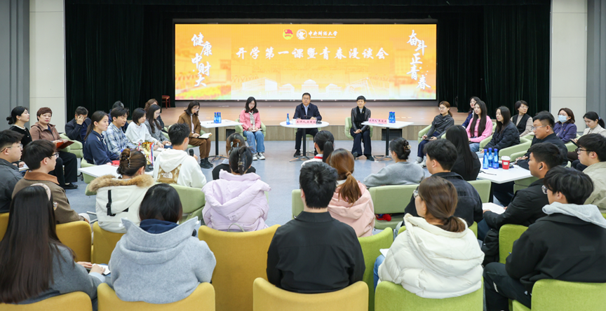 3月18日下午,校党委书记吴国生来到沙河校区大学生活动中心融想多功能厅,走进新学期“青春漫谈会”,并以“健康中财大 奋斗正青春”为主题,为青年师生讲授“开学第一课”。活动由校党委副书记、副校长朱凌云主持。
