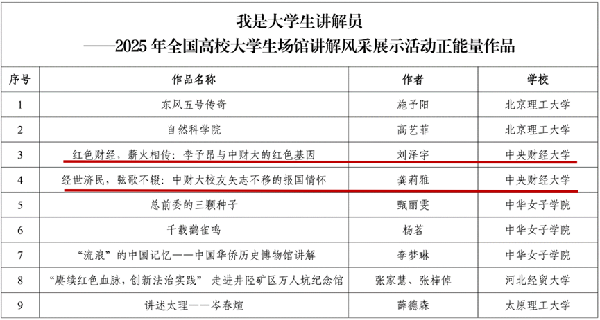 近日,在由教育部中国大学生在线主办的“我是大学生讲解员——2025年全国高校大学生场馆讲解风采展示活动”中,我校报送的2项作品从全国百余所高校的参赛作品中脱颖而出,入选全国百件正能量作品。