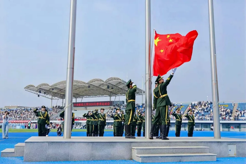 国旗方阵庄严入场,擎旗手振臂一挥。校旗方阵、旗林方阵步伐整齐,昂首阔步经过主席台。红旗猎猎映初心,步履坚定向未来。他们以昂扬之姿展风采,以拼搏之力竞风流,充分展现新时代中财大人求真求是、追求卓越的精神面貌。