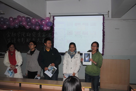 12月10日晚,由金融学院研究生会学术部主办的第一届研究生英语电影配音大赛在学院南路校区主教217举行。本次大赛共有9支队伍参赛,并请到学校办公室管理科胡新老师,学校宣传部宋红美老师以及外语学院李巧平老师作为本次比赛评委。