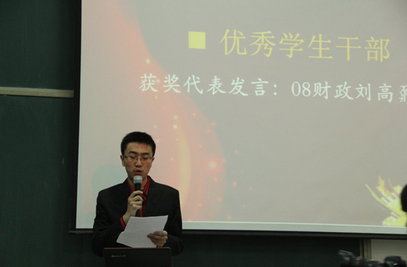 随后,由财政学院党总支副书记姜爱华宣读获奖通知。本次颁奖典礼共评出包括学风优良先进个人、学术创新先进个人等在内的12个奖项,获奖学生138名。财政学院教师为各个奖项获奖同学颁发了荣誉证书。其中08财政2班的刘高鼐沅代表优秀学生干部发言。在发言中,刘高鼐沅同学以自身的经历,告诉同学们要学会从学生工作中收获点滴,学会与老师交流沟通,学会在工作细节中积累人生的财富。从刘高鼐沅同学的学生工作经验中,同学们感受到了学生工作对于大学生活以及塑造个人成才的重要性;作为优秀志愿服务者代表,09财政2班崔颖同学动情讲述了自己在暑期支教等公益活动中的收获与感动,并号召大家积极投身于志愿服务活动,同学们在倾听中对于公益事业有了更加独特的认识;来自08财政1班的李奥雷同学代表学习进步奖获得者进行发言。李奥雷同学首先对老师们辛勤的付出、细微的关怀表达了感谢。随后,与同学们分享了自己学习过程中体验到的从焦虑不安到豁然开朗,从彷徨到醒悟的感受。最后,李奥雷同学代表全体学生表示有信心、有勇气、有决心在学习的道路上努力拼搏。