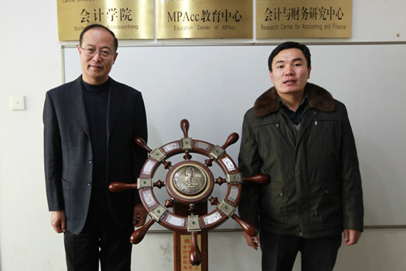 11月17日,会计学院2010届博士毕业后返回母校,向会计学院赠送了领航舵,表达了2010届博士对学院的老师和学弟学妹的良好祝愿:“祝会计学院成为会计教育的领航者,中财会计学子成为行业领航者”,祝愿会计学院在新时期、新起点,继续乘风领航,创造更多辉煌,祝愿会计学院的毕业生都能成为各个行业的领航者、价值创造者。
