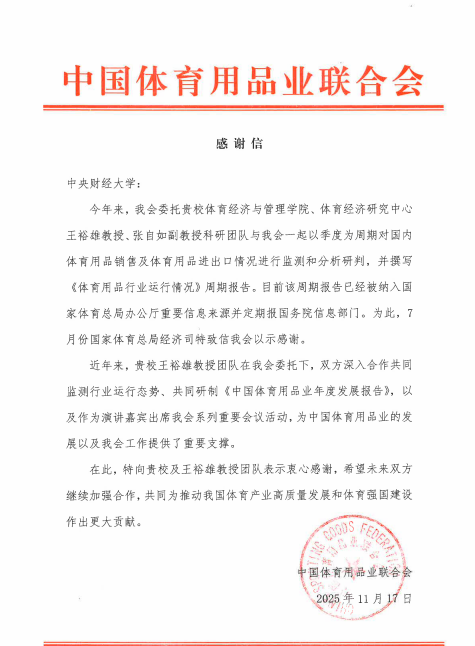 近日,中国体育用品业联合会向我校发来感谢信,对体育经济与管理学院王裕雄教授、张自如副教授科研团队在体育用品行业运行监测与研究方面作出的专业贡献表示感谢。