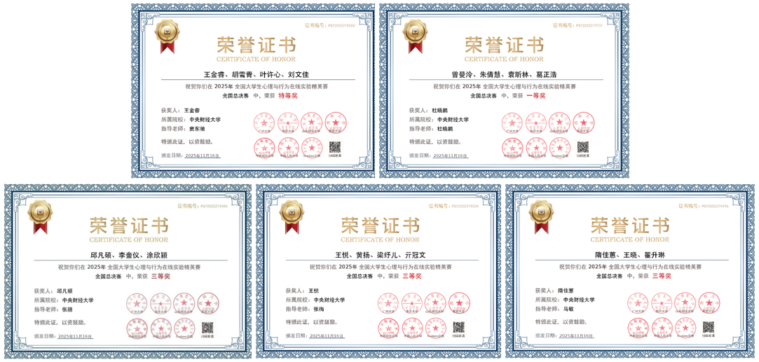 本届赛事由中央财经大学社会与心理学院、Credamo见数联合承办,中国心理学会经济心理学专业委员会、中国社会心理学会大数据网络心理学专业委员会担任学术指导单位。比赛自2025年5月启动,来自323所高校的6691人报名参赛。我校心理学科始终坚持将前沿理论与在线实验等创新实践深度融合,构建了独具特色的人才培养生态,为培养新时代心理学高端人才、服务国家社会发展持续贡献中财大力量。