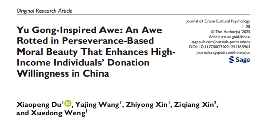 近日,中央财经大学社会与心理学院心理学系辛志勇教授和杜晓鹏助理教授团队在跨文化心理学国际期刊《Journal of Cross-Cultural Psychology》发表研究成果,提出并系统阐释了一种植根于中国文化、并具有现实性和潜在文化普适性的敬畏类型——“愚公式精神敬畏”。该研究发现,这种由普通人坚忍不拔的精神力量所激发的敬畏体验,不仅能够提升高收入群体的慈善捐赠意愿,也有助于弱化对贫困群体的负面刻板印象,为理解促进公益行为和改善社会认知提供了新的视角。《Journal of Cross-Cultural Psychology》为我校AA类期刊,近5年综合影响因子为3.3。作为跨文化心理学领域的旗舰期刊,该刊为研究文化与行为关系的学者提供了重要的跨学科交流平台,是全球跨文化研究的重要知识来源和学术纽带。论文在线链接:https://journals.sagepub.com/doi/10.1177/00220221251385963。