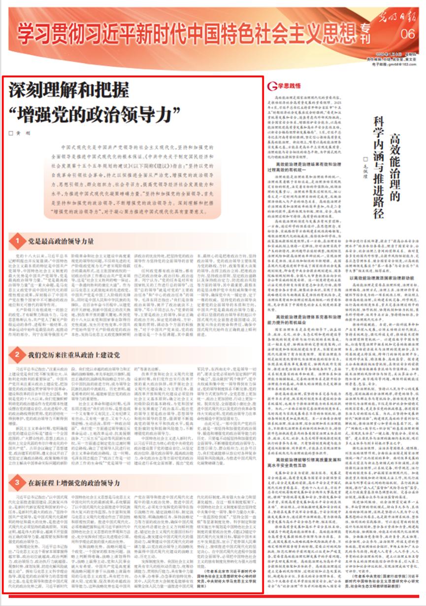 1月8日,《光明日报》学习贯彻习近平新时代中国特色社会主义思想专刊刊发我校马克思主义学院黄刚教授的署名文章《深刻理解和把握“增强党的政治领导力”》。