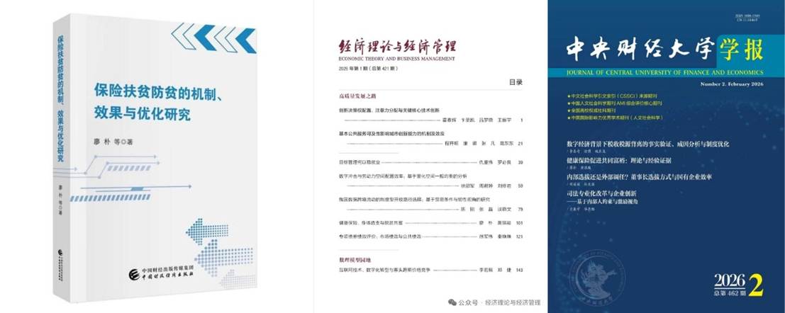 近日,保险学院廖朴教授团队在保险普惠金融领域的研究获一系列成果,出版专著《保险扶贫防贫的机制、效果与优化研究》,并连续在《经济理论与经济管理》《中央财经大学学报》等国内权威期刊发表学术论文,持续为普惠保险高质量发展提供学术支撑与决策参考。