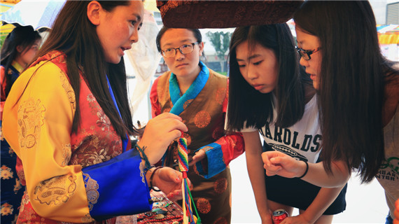 作为特邀展示活动的藏文化展览将西藏的风土人情、衣食住行一一呈现,带来雪域高原神秘而肃穆,多彩而淳朴的文化氛围。广场上挂满各色的在藏语中被称为“隆达”的经幡,藏族小伙和姑娘们身穿藏族传统服饰,脸上洋溢着淳朴而动人的微笑。展示活动以通关游戏的方式,让同学们在游戏中了解藏族的文化,通过每一关都可以拿到富有藏族特色的小礼物,如藏族特色小吃,藏文写的祝词,自己名字的藏文翻译,精美的手链,哈达等。同时藏文书籍、配饰、服装、乐器、转经轮等富有藏族特色的展品一一陈列。