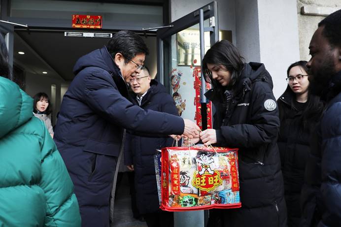 在学生宿舍,吴国生、马海涛代表学校向同学们致以新春的美好祝福,亲切询问同学们留校期间的生活需求,认真听取大家对学校工作的意见建议,叮嘱同学们做好假期规划、注重身心健康,在劳逸结合中精进专业素养,度过安全、充实、有意义的假期。活动现场其乐融融,师生共同写福字、赠春联,在温馨融洽的氛围中恭贺新春、寄托美好期盼。