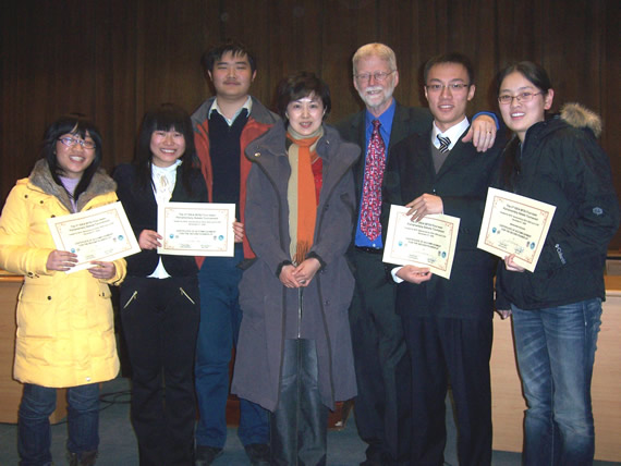 获奖的四位同学(从左至右):英语实验班07级注会赵鸿、聂晨鸣,07级精算陈艺雅和07级国经贸延慧颖
