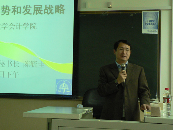 2006年12月6日下午,我校会计学院邀请中国注册会计师协会秘书长陈毓圭教授来我校作了“注册会计师行业形势与发展战略”的专题演讲。会计学院的教师与学生一起聆听了讲座,能容纳180人的主教206教室座无虚席。