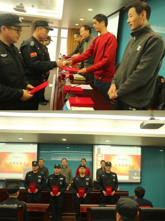 郁泉副处长宣读《关于表彰和奖励2018-2019学年第一学期“优秀保安员”的决定》(保字〔2019〕1号),彭庆洪、谢亚衡、臧波、刘朋朋、李占勇、闫晓亮等28名保安员获得本学期“优秀保安员”称号。与会领导为获奖保安员颁发了荣誉证书。优秀保安员闫晓亮代表全体保安员发言,以“甘于平凡、勤于学习、勇于奉献”的精神与全体保安员共勉,表示今后将更加努力,为师生安全、校园稳定贡献更大的力量。