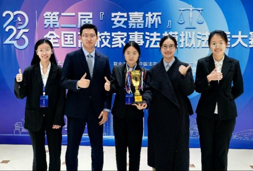 我校代表队由杜文雅、邓锐、邓锡睿、方源、付欣怡五名同学组成,法学院副教授徐建刚指导。备赛过程中,队员们系统梳理家事法律体系,深入研习典型案例,反复演练庭审环节。赛事期间,队员们沉着冷静、应对从容,自小组赛稳步出线,历经复赛、半决赛的激烈交锋,闯入决赛。