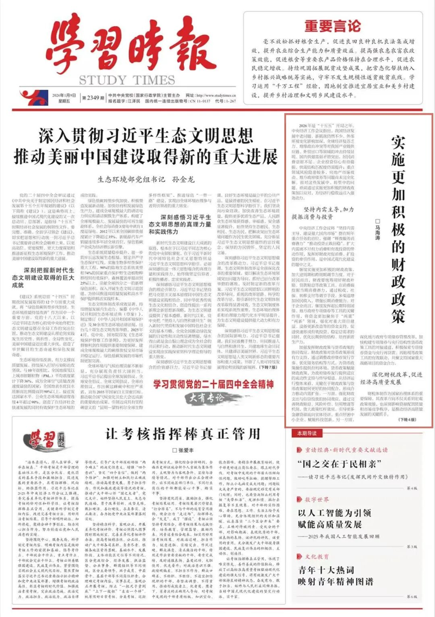 1月9日,校长马海涛教授撰写的文章《实施更加积极的财政政策》发表于《学习时报》头版。文章认为,面对我国经济发展中、转型中的挑战,亟须通过实施更加积极的财政政策加以应对,坚持内需主导,加力提振消费与投资;深化财税改革,促进经济高质量发展;严守民生底线;为人民群众多办实事,为经济行稳致远注入强劲动力。