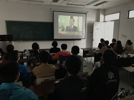 同学们也时刻关注十九大闭幕。食堂里,就餐的同学们不时抬头收看电视屏幕上播出的闭幕会现场;教室中,同学们在老师的带领下集体观看十九大闭幕会。